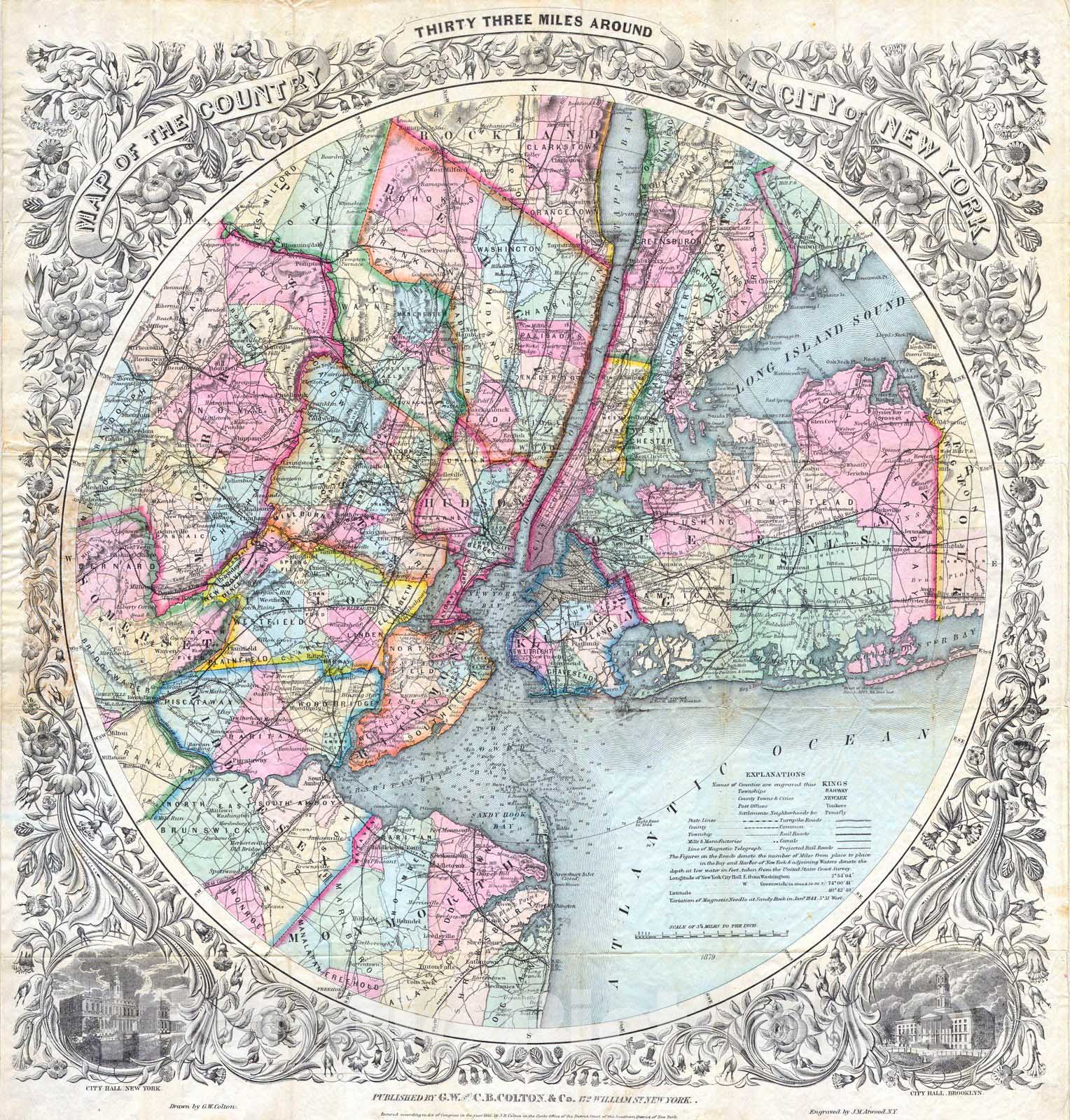 This is the extremely rare 1879 edition of one of the most beautiful pocket maps of New York made in the 19th century: Colton's Thirty Three Miles Around the City of New York. Covers New York City and vicinity as far south as Ocean County, NY, as far east as Suffolk County, as far north as Rockland County, and as far west as Somerset County. Reveals the area in considerable detail with special attention to settlements, tolls, roads, and railroads. Documents innumerable areas of interest included the New Lots in Brooklyn and a very early Central Park. New York Bay and Harbor offers numerous depth soundings taken from the 1858 U.S. Coast Survey of the region. Surrounded by a splendid decorative border with engraved views depicting "City Hall, New York" and "City Hall, Brooklyn." This map was drawn and engraved by J. M Atwood based upon J. H. Eddy's 1811 map of the same name. Colton's success with this attractive map was such that it was issued in various editions for over 50 years. Haskell notes eight different editions between 1846 and 1873 and Rumsey has a variant dated 1891. We have found no references to our 1879 variant in any major collection or reference work. Folds into its original dark green linen binder. Miniature map of the city in gilt stamped on the cover. Dated 1870 under the title and, at the base of the map, the copyright reads: "Entered according to the Act of Congress in the Year of 1846 by J. H. Colton & Co. in the Clerk's Office of the District Court of the Southern District of New York." Published by Johnson & Browning from their 172 William Str. Office in New York City.