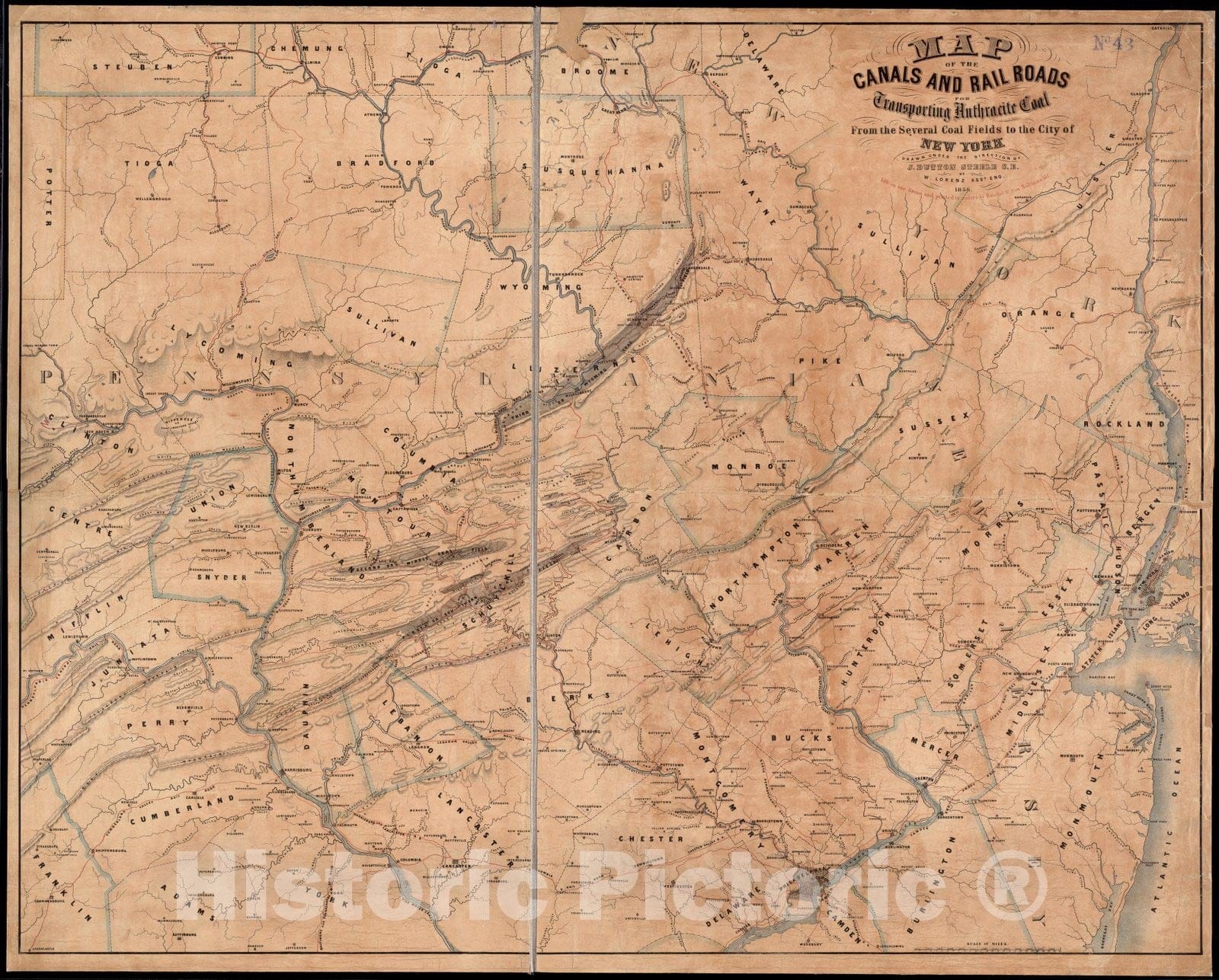 • .Historical Map, 1856 Map of The canals and Rail Roads for Transporting Anthracite Coal from The Several Coal Fields to The City of New York, Vintage Wall Art