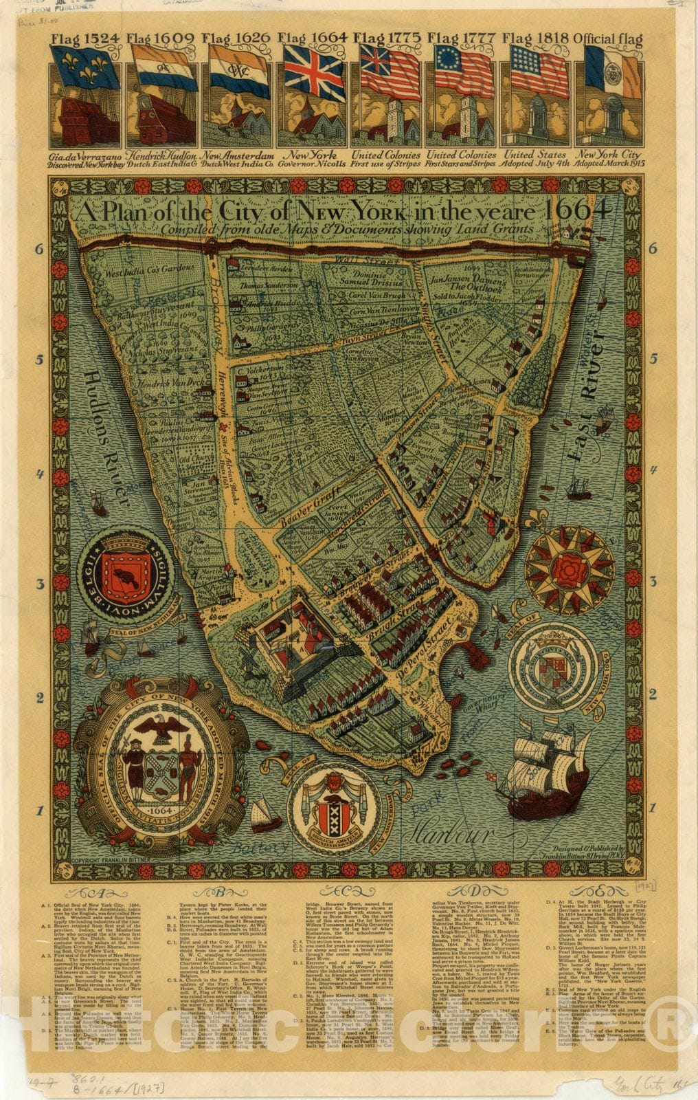 Map : New York, A plan of the city of New York in the yeare [sic] 1664 : compiled from olde maps & documents showing land grants , Antique Vintage Reproduction