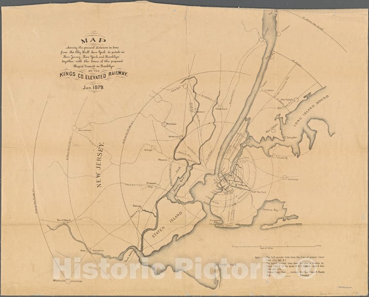 Historic 1876 Map - Map Showing The Present Distances In Time From The City Hall Newof New York City And State - New York City & Vicinity - Vintage Wall Art