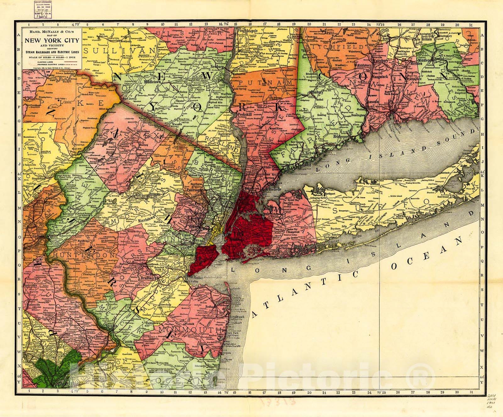 • Historic 1908 Map - Rand, McNally & Co.'s map of New York City and Vicinity Showing Steam Railroads and Electric Lines.