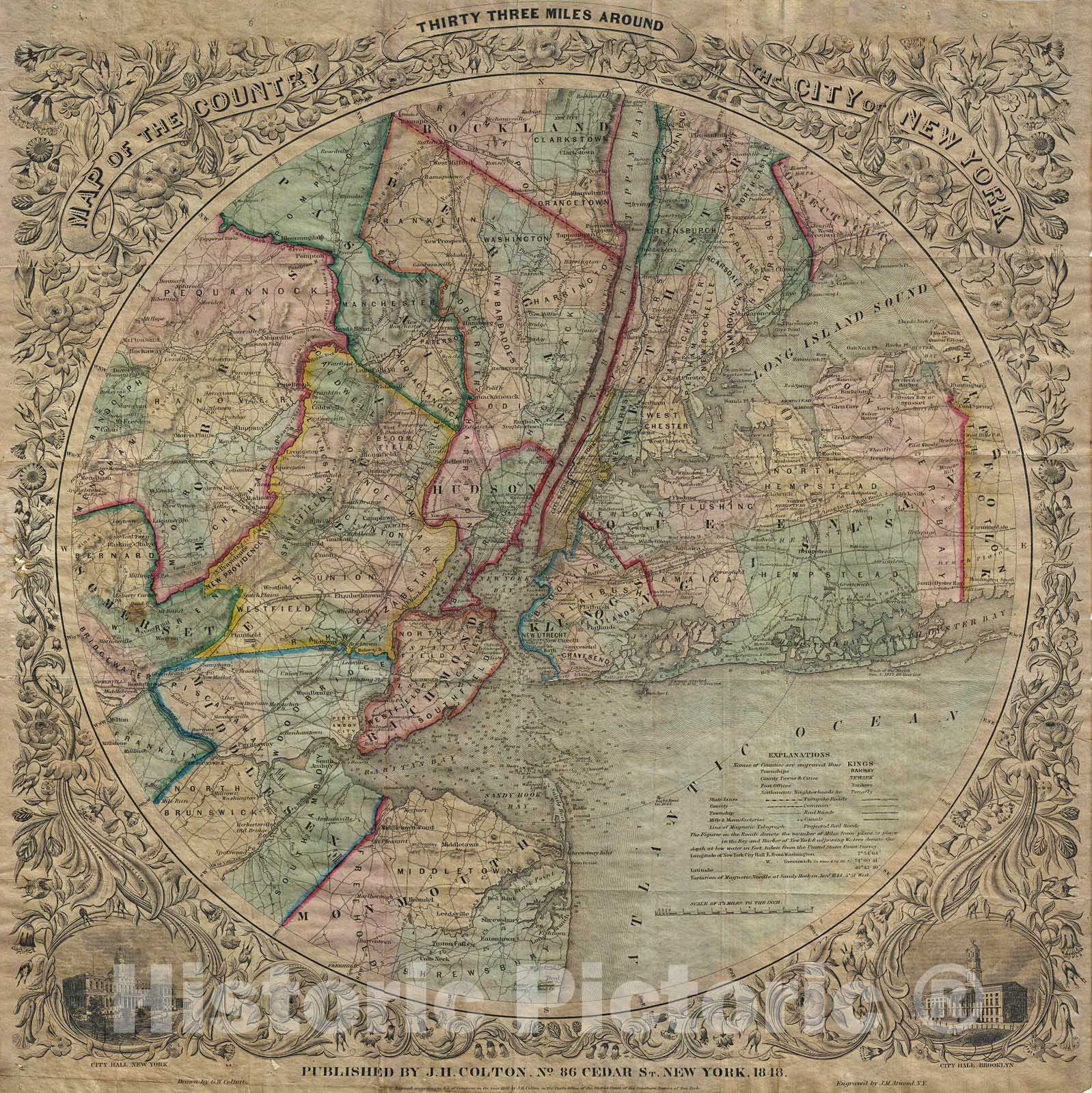 • .Historic Map : Colton Map of New York City and Vicinity (33 Miles Around) , Version 2, 1848, Vintage Wall Art