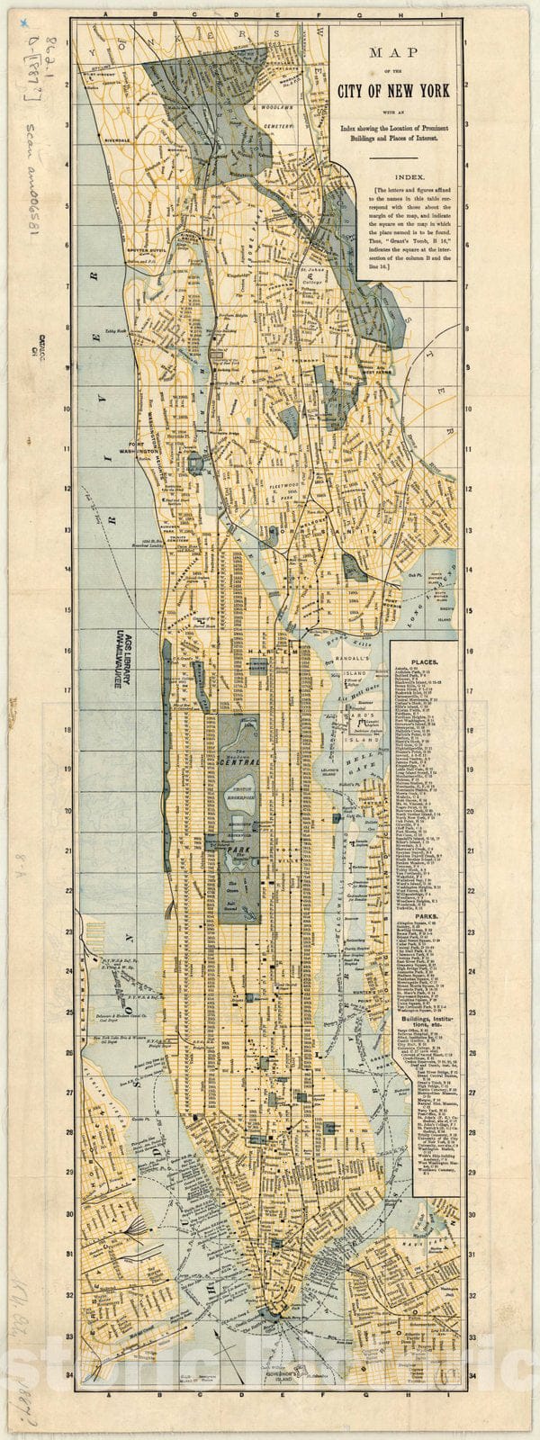 Map : New York City 1897, Map of the City of New York : with an index showing the location of prominent buildings and places of interest, Antique Vintage Reproduction