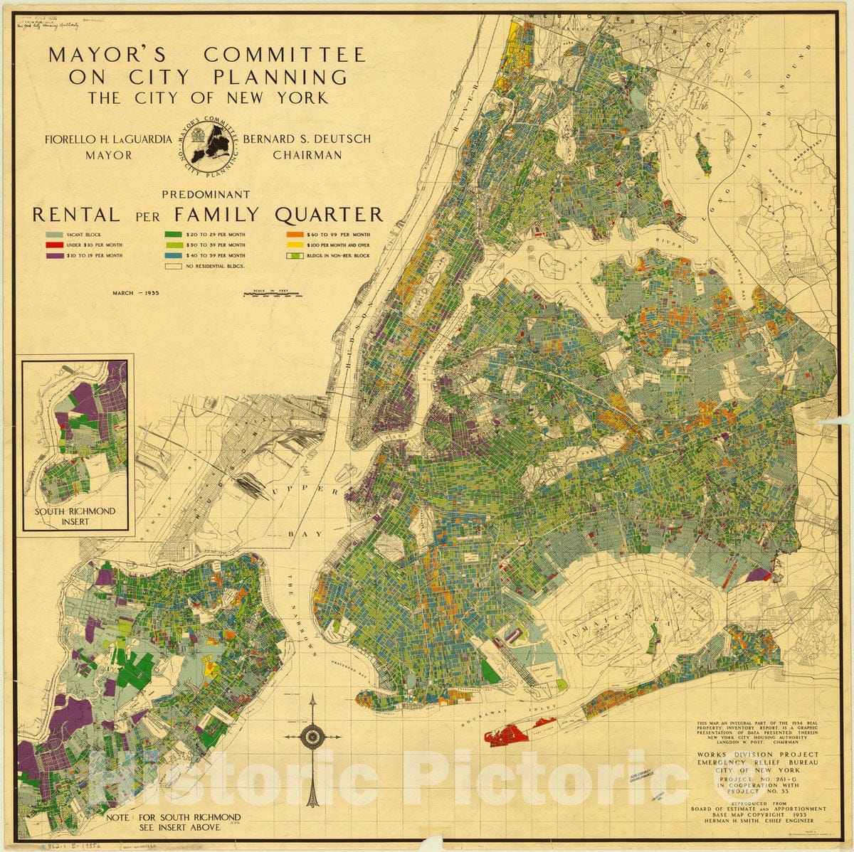 Map : New York City, New York 1935, Predominant rental per family quarter , Antique Vintage Reproduction