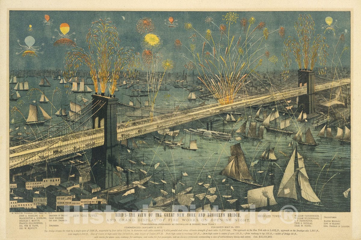 Art Print : A. Major - Bird's-Eye View of The Great New York and Brooklyn Bridge, and Grand Display of Fireworks on Opening Night.May 24, 1883 : Vintage Wall Art