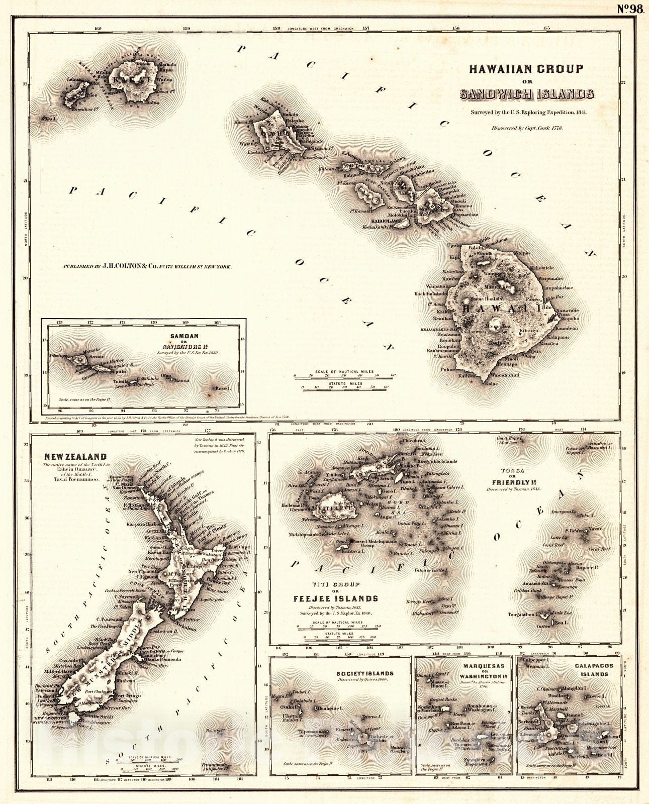 • .Historic Map : 1857 Hawaiian Group or Sandwich Islands; Samaan or Navigators Islands; New Zealand; Tonga or Friendly Islands; Galapagos Islands : Vintage Wall Art