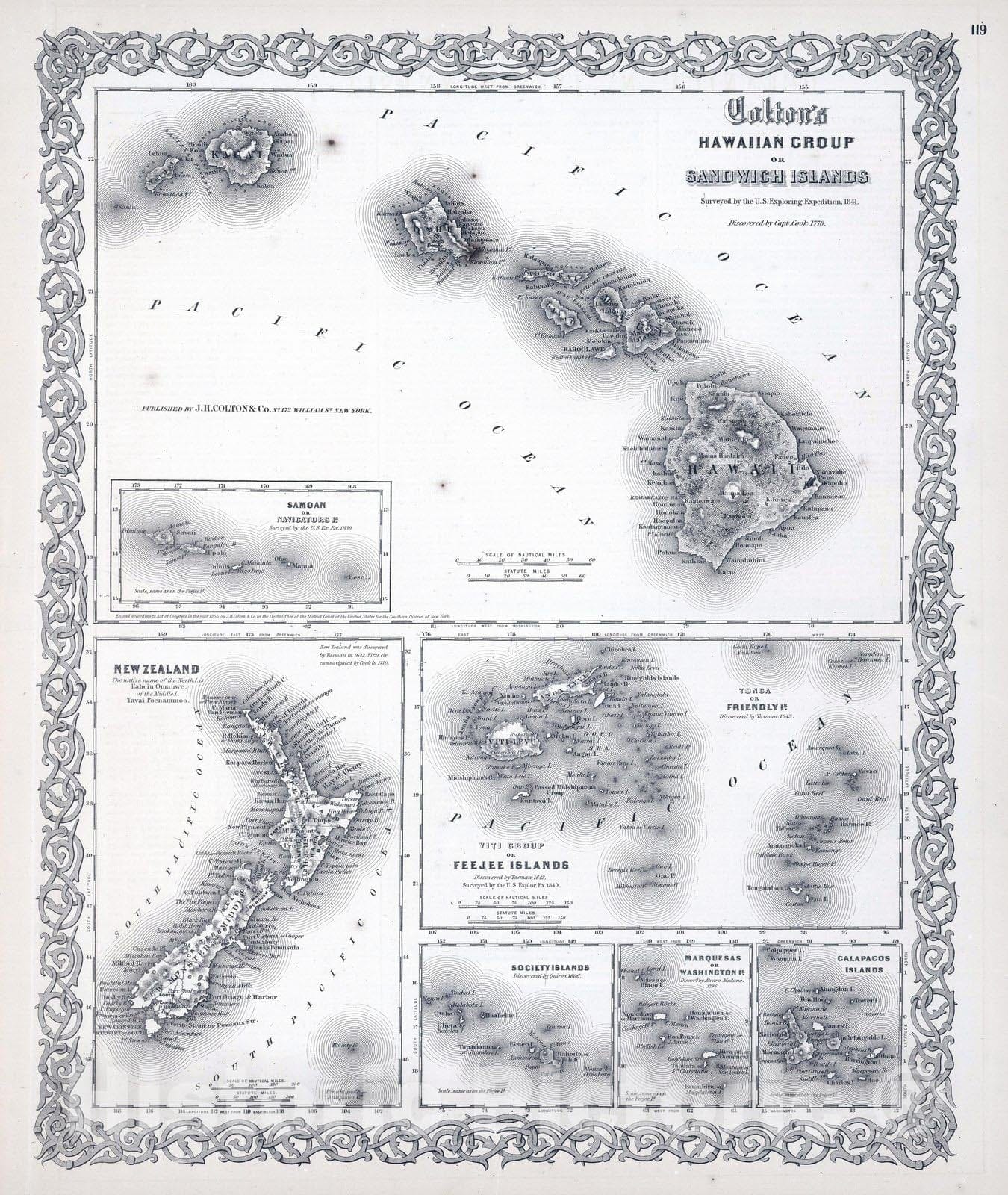 • .Historic Map : 1865 Hawaiian Group or Sandwich Islands. New Zealand. Viti Group of Feejee Islands. Tonga or Friendly Islands. - Vintage Wall Art