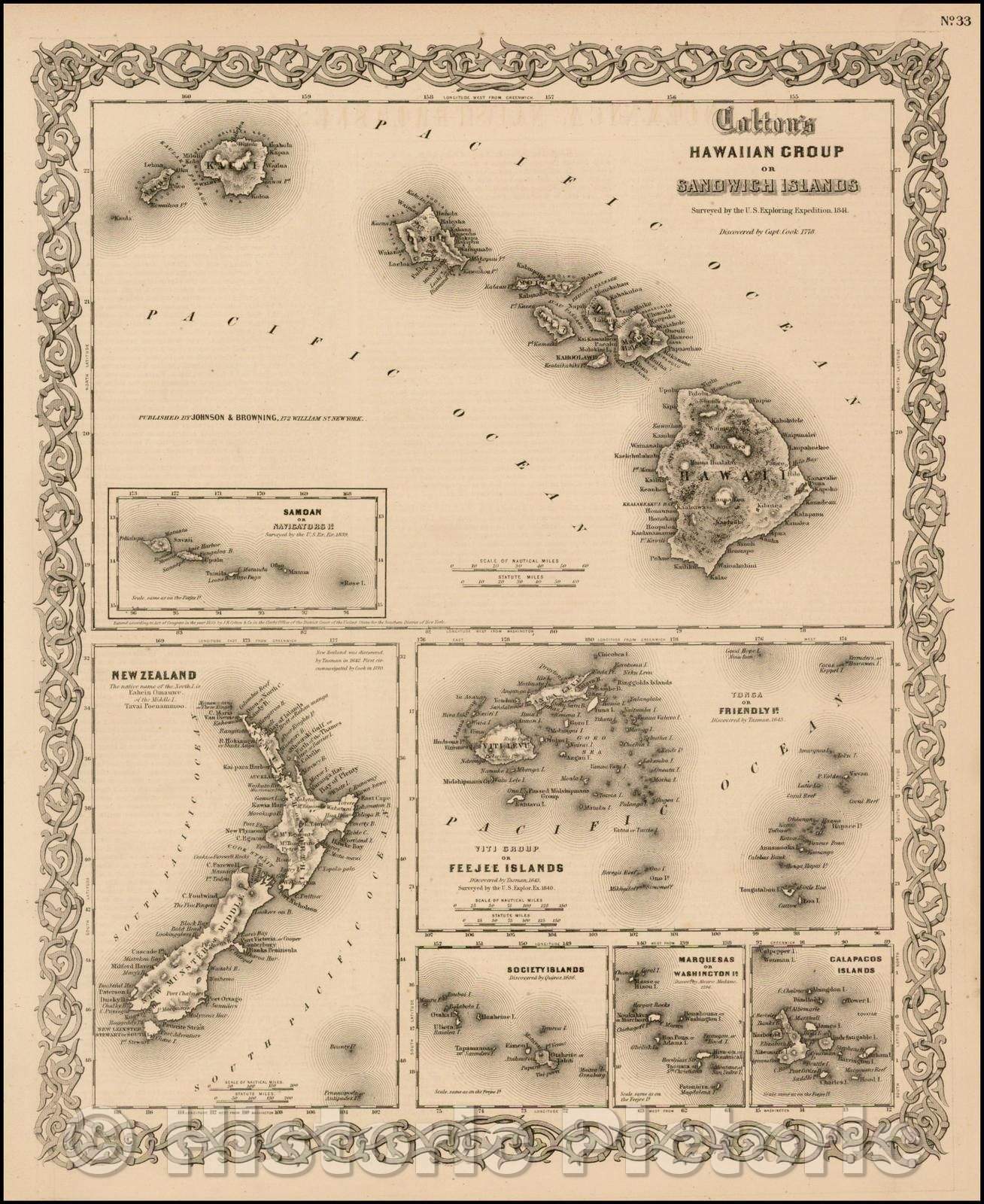 • .Historic Map - Colton's Hawaiian Group or Sandwich Islands [with] New Zealand [and] Feejee Group, Society Island, Marquesas and Galapagos Islands, 1859 - Vintage Wall Art