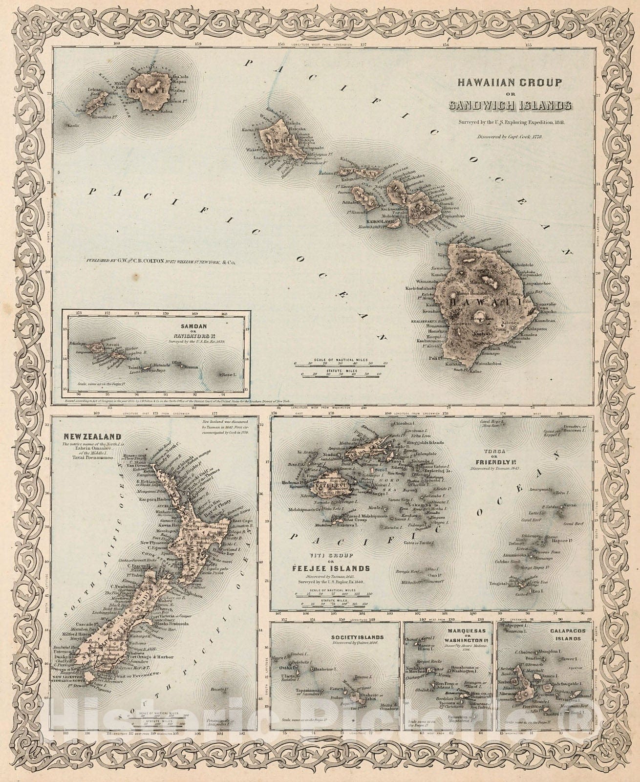 • .Historic Map : Hawaii. New Zealand. Fiji. Society Islands. Marquesas. Galapagos., 1880, Vintage Wall Decor