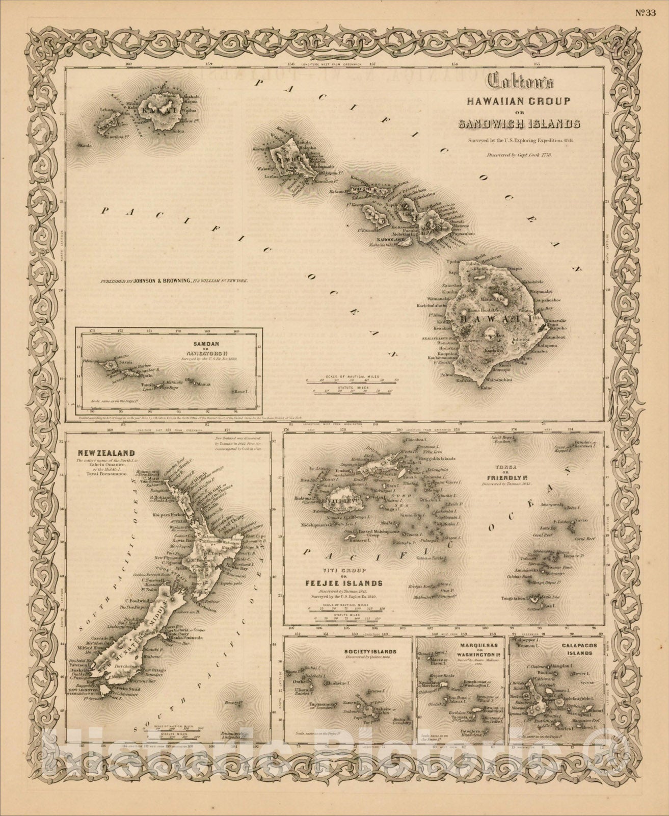 • .Historic Map : Hawaiian Group or Sandwich Islands with New Zealand [and] Feejee Group, Society Island, Marquesas and Galapagos Islands, 1855, Vintage Wall Art