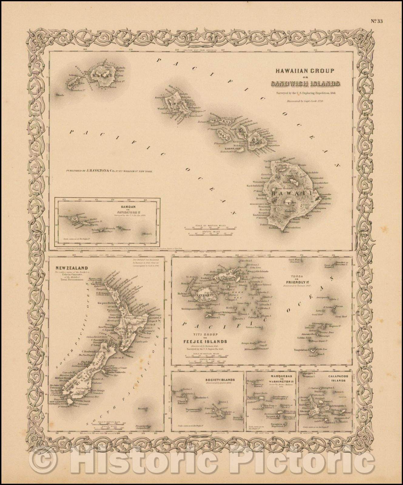 Historic Map - Hawaiian Group or Sandwich Islands [with] New Zealand [and] Feejee Group, Society Island, Marquesas and Galapagos Islands, 1855 v4