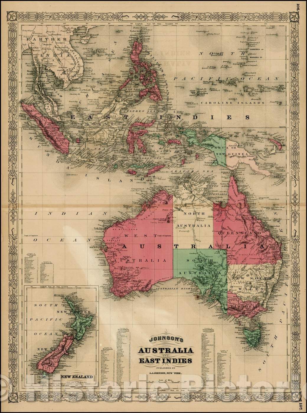 Historic Map - Johnson's Australia and East Indies [New Zealand inset], 1867, Alvin Jewett Johnson - Vintage Wall Art