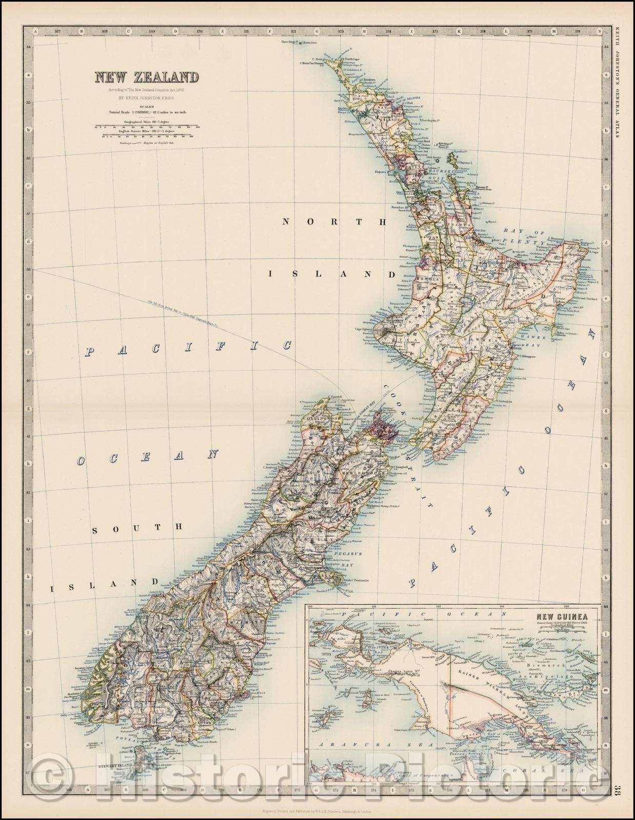 • .Historic Map - New Zealand According to, 1880, W. & A.K. Johnston - Vintage Wall Art