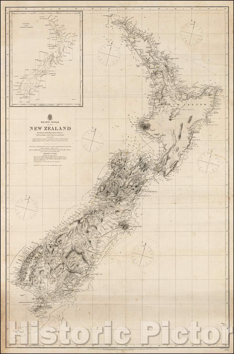 Historic Map - New Zealand from Surveys in H.M. Ships Acheron & Pandora Captn. J.L. Stokes, Commdrs. B. Drury and G.H. Richards, 1872, British Admiralty - Vintage Wall Art