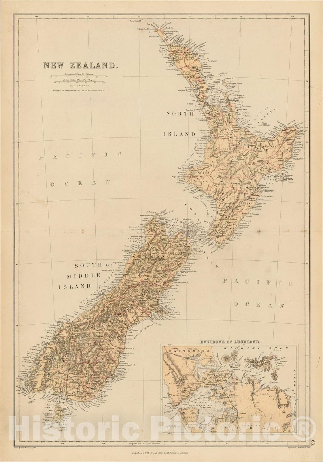 New Zealand (with Environs of Auckland), c1860, Blackie & Son, v1, Vintage Wall Art :