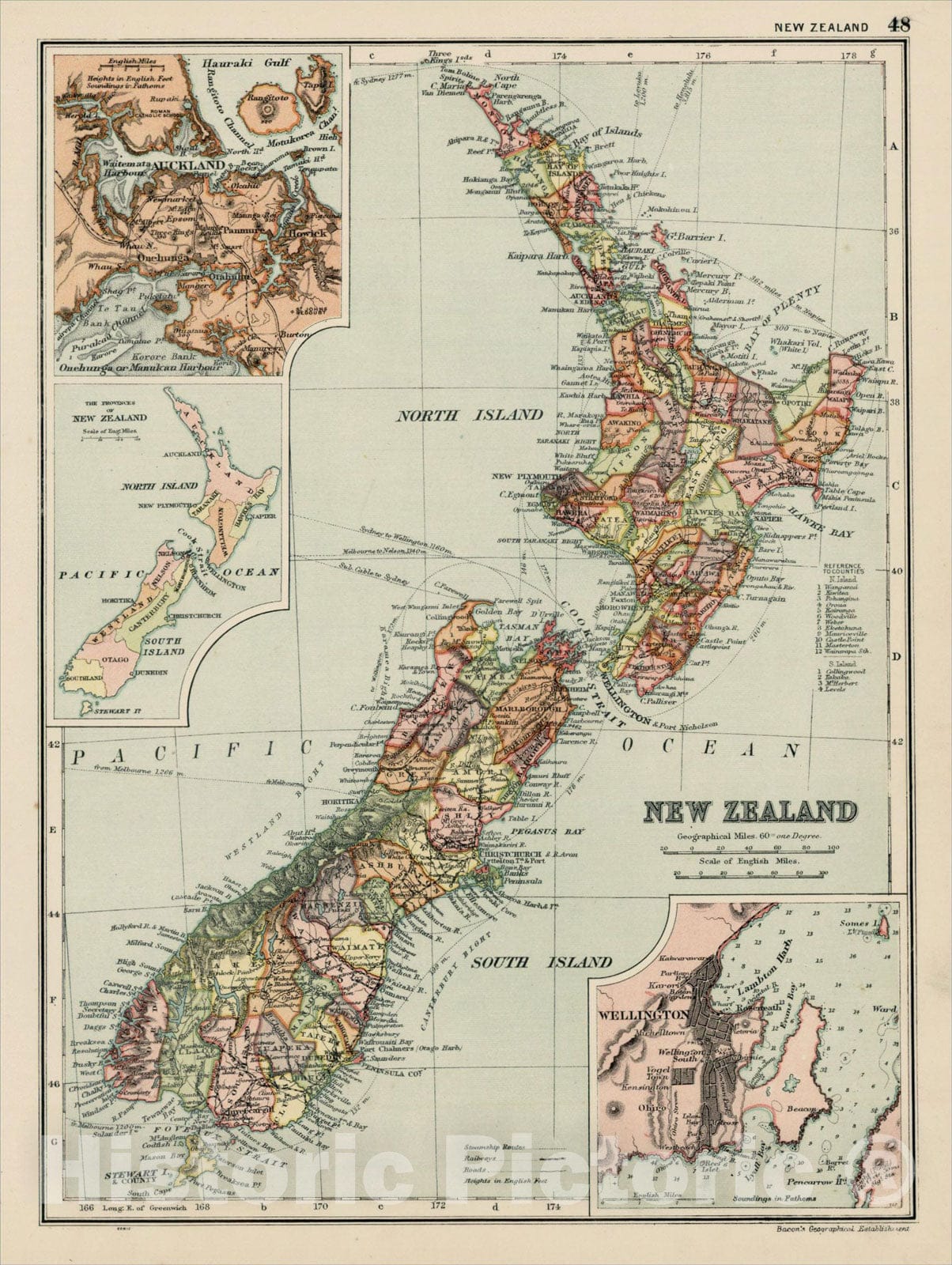 • .Historic Map : New Zealand (with insets of Auckland and Wellington), 1898, Bacon & Co., Vintage Wall Art