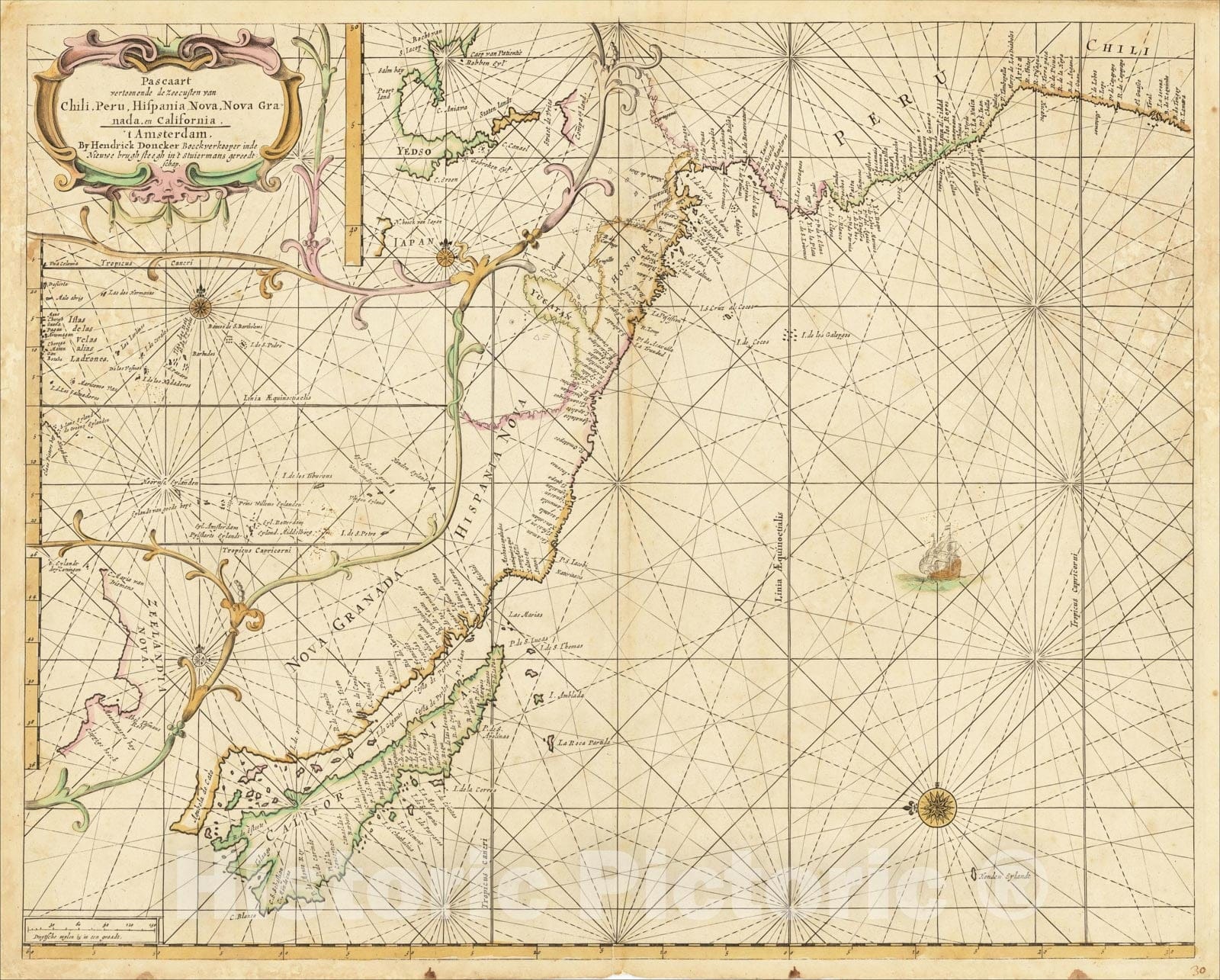 Historic Map : Pascaart vertoonende de zeecusten van Chili, Peru, Hispania Nova, Nova Granada, en California??. [Early New Zealand Inset], 1660, Vintage Wall Art