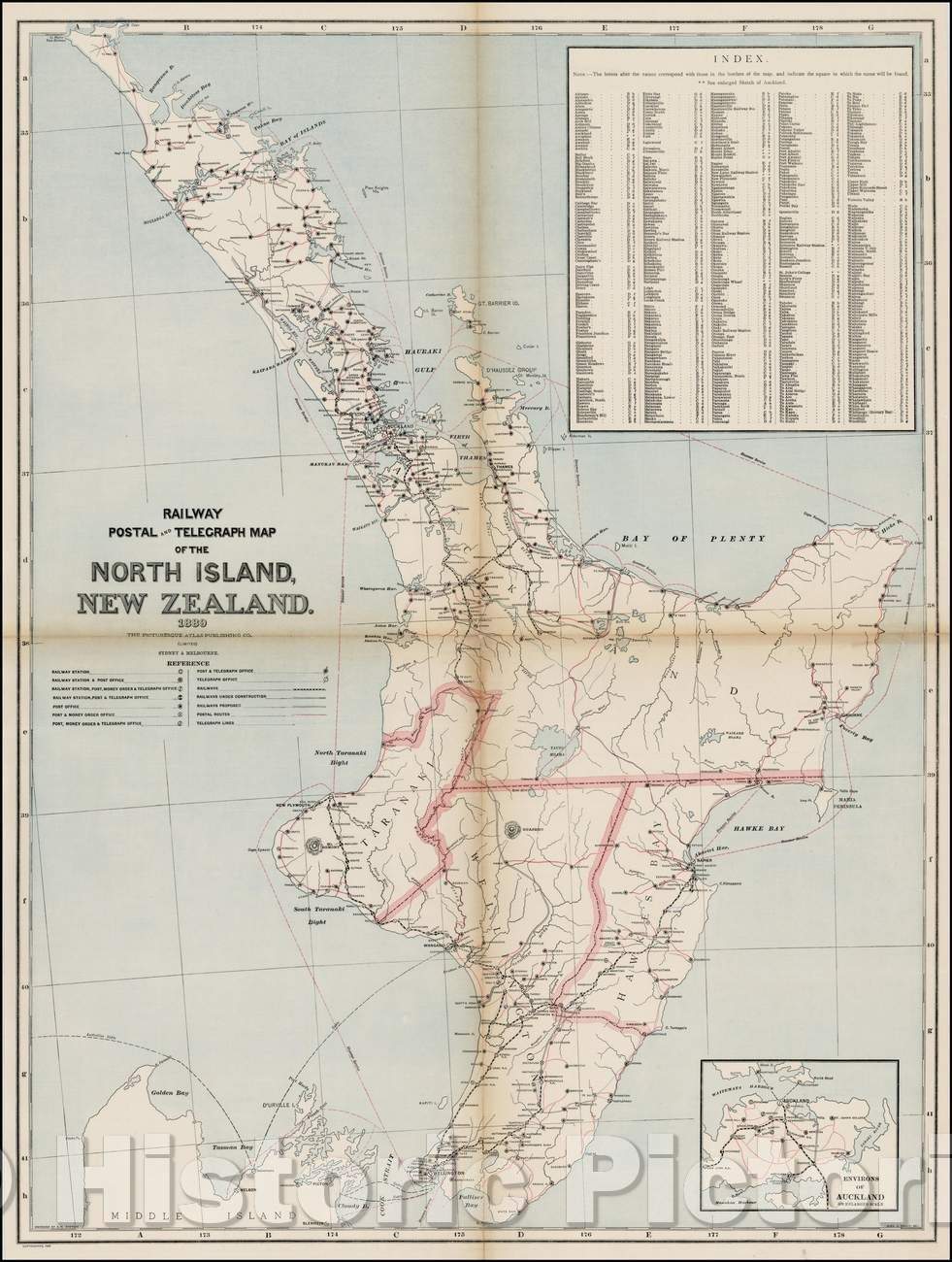 Historic Map - Railway Postal and Telegraph Map of the North Island New Zealand, 1889, Andrew Garran - Vintage Wall Art