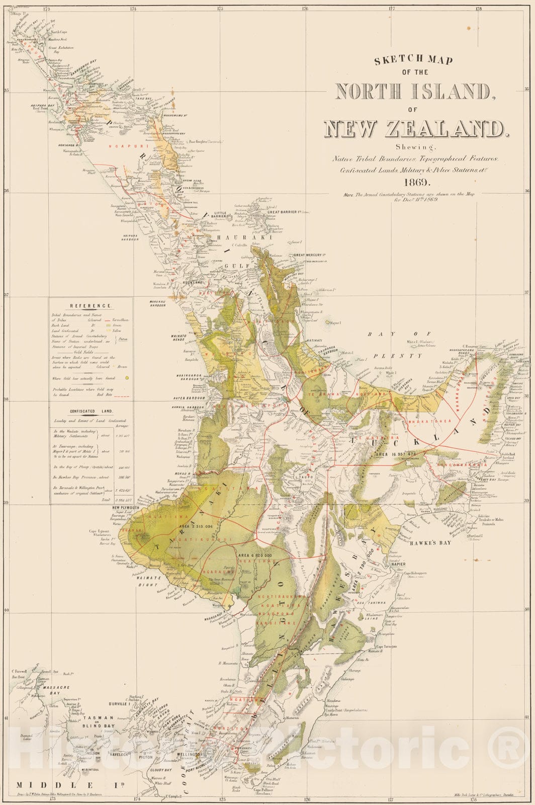 Historic Map - Sketch Map of the North Island of New Zealand. Shewing, Native Tribal Boundaries, Topographical Features, 1869, Mills, Dick, Lister & Co. - Vintage Wall Art