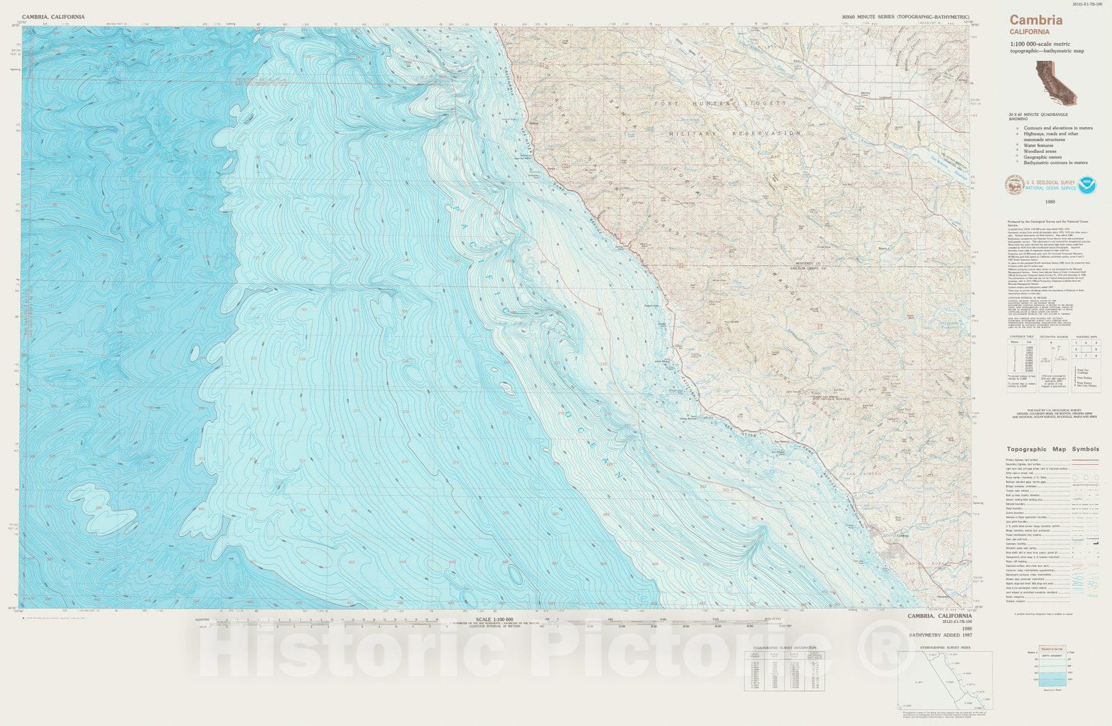 Historic Nautical Map - Cambria, CA, 1980 NOAA Topographic Bathymetric Historic Nautical Map - Vintage Wall Art