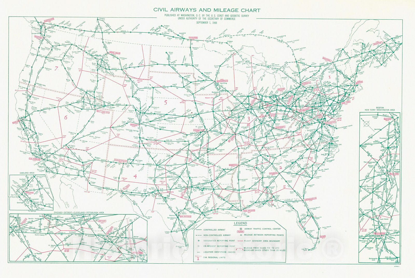 Historic Nautical Map - Civil Airways And Mileage Chart, 1948 AeroNOAA Chart - Vintage Wall Art