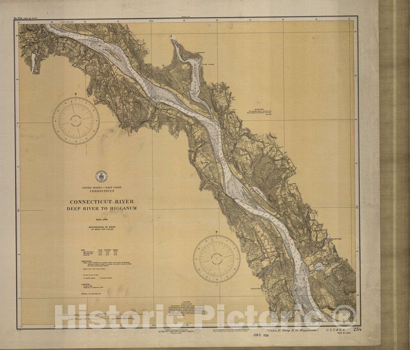 Historic Nautical Map - Connecticut River : Deep River To Higganum, 1934 NOAA Chart - Vintage Wall Art