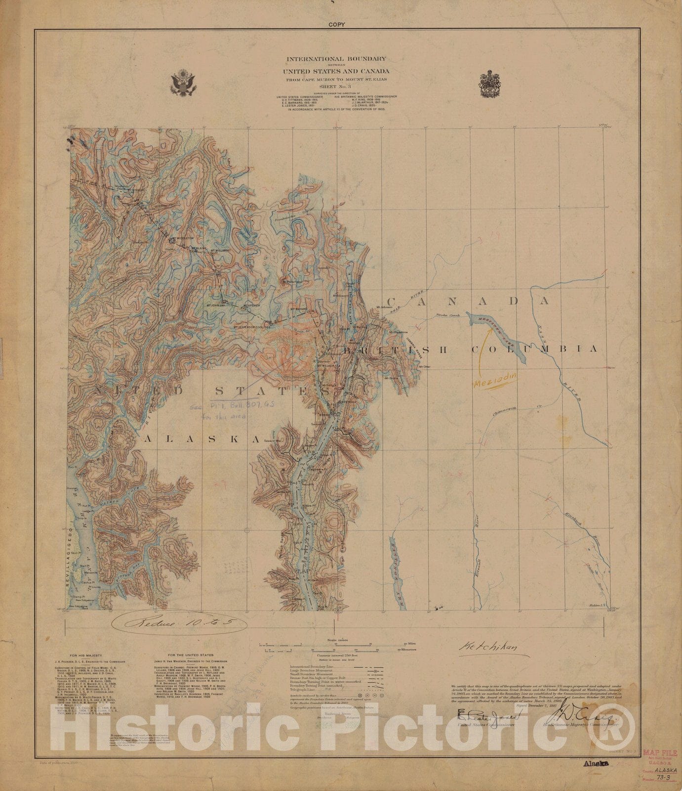 Historic Nautical Map - International Boundary, From Cape Muzon To Mount St. Elians, Sheet No .3, AK, 1927 NOAA Topographic - Vintage Wall Art
