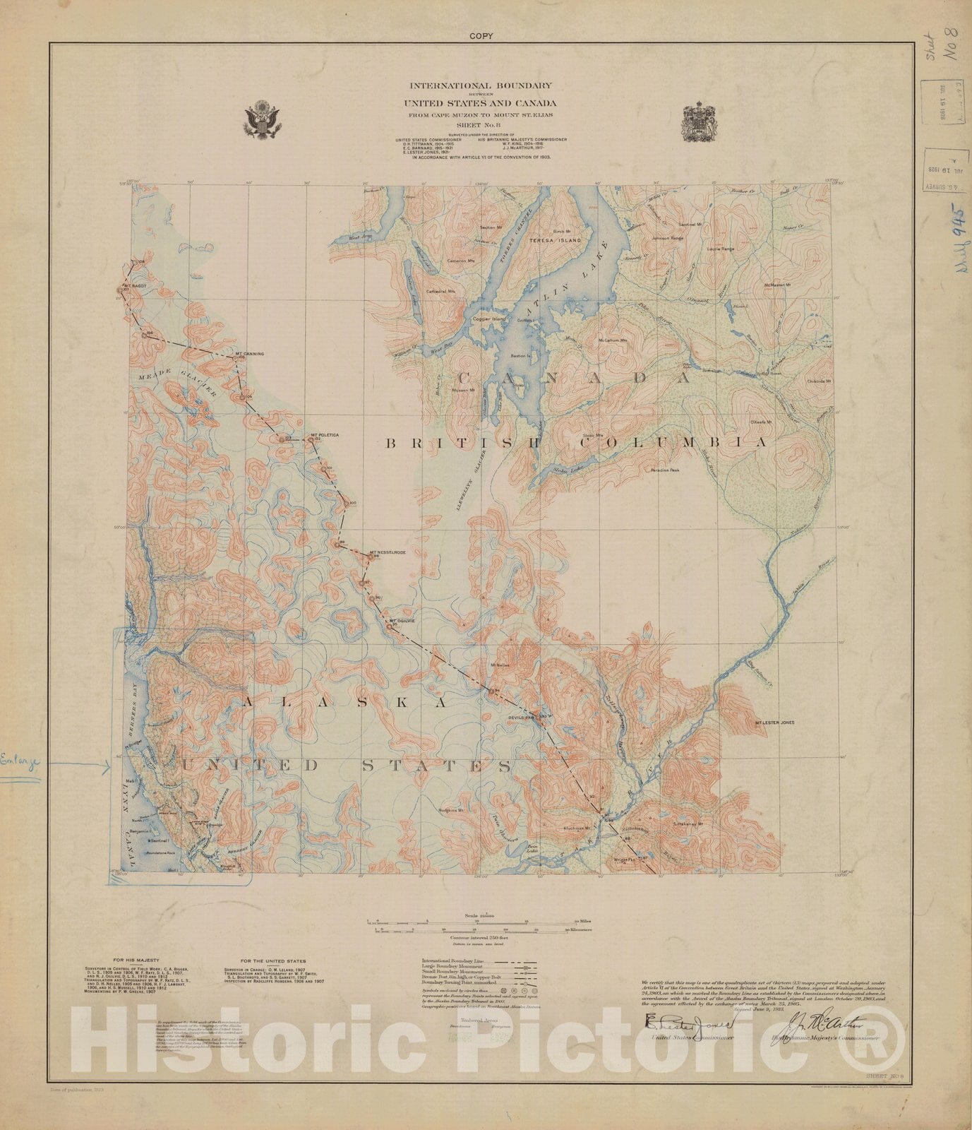 Historic Nautical Map - International Boundary, From Cape Muzon To Mount St. Elians, Sheet No.8, AK, 1923 NOAA Topographic - Vintage Wall Art, v2
