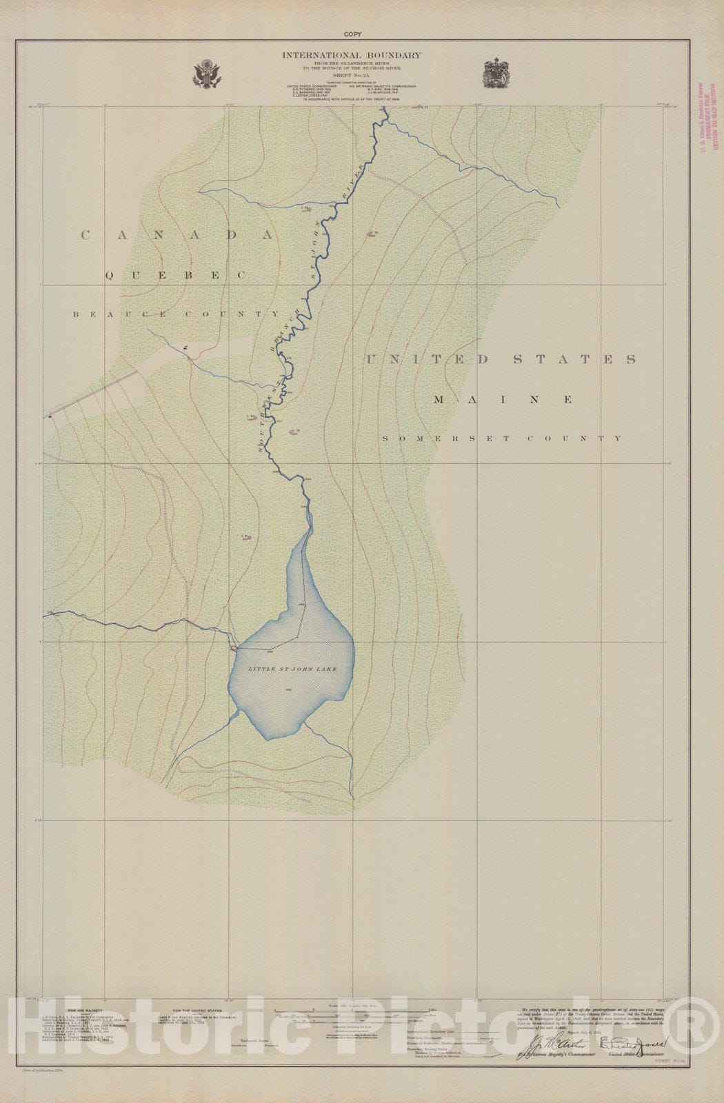 • .Historic Nautical Map - International Boundary, From The St. Lawrence River To The Source Of The St. Croix River, Sheet No. 24, ME, 1924 NOAA Topographic - Vintage Wall Art