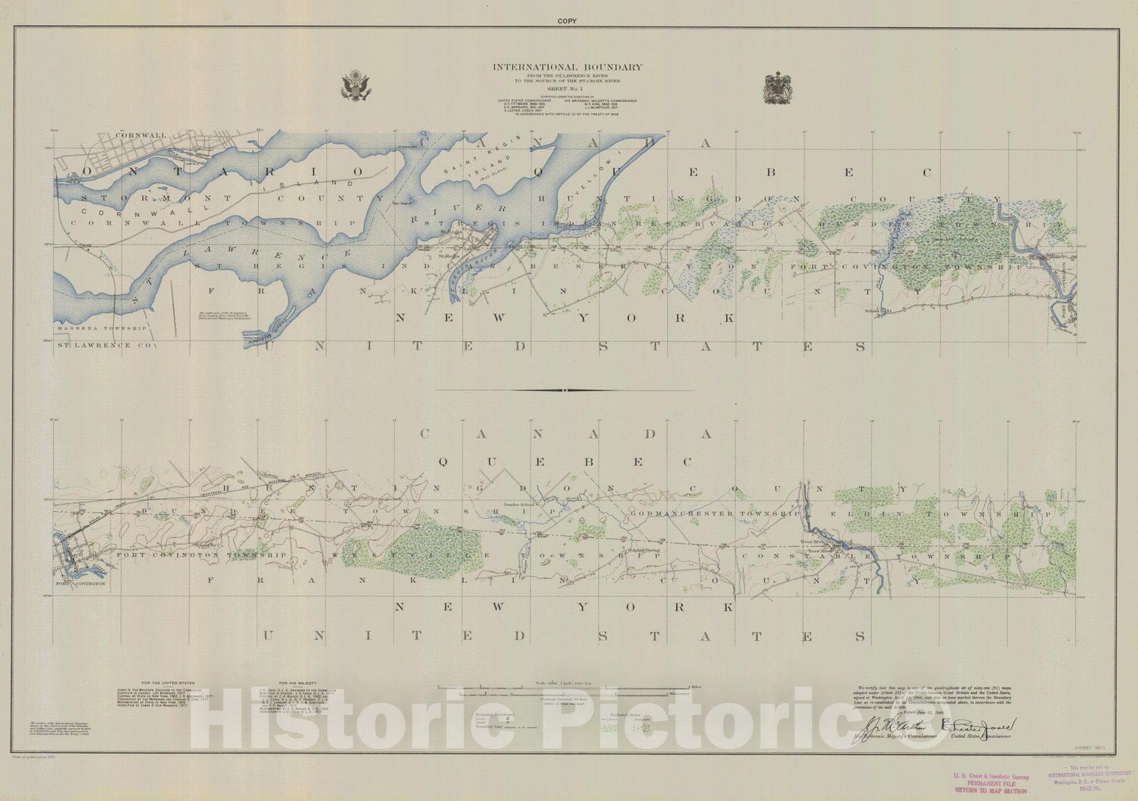 • .Historic Nautical Map - International Boundary, From The St. Lawrence River To The Source Of The St. Croix River, Sheet No. 1, NY, 1922 NOAA Topographic - Vintage Wall Art