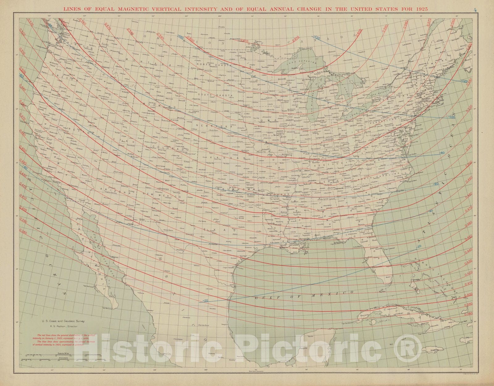 Historic Nautical Map - Lines Of Equal Magnetic Vertical Intensity And Of Equal Annual Change In The United States For 1925, 1925 NOAA Magnetic - Vintage Wall Art