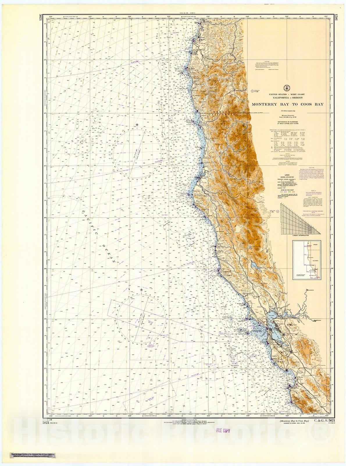Historic Nautical Map - Monterey Bay To Coos Bay, 1966 NOAA Chart - Oregon, California (OR, CA) - Vintage Wall Art