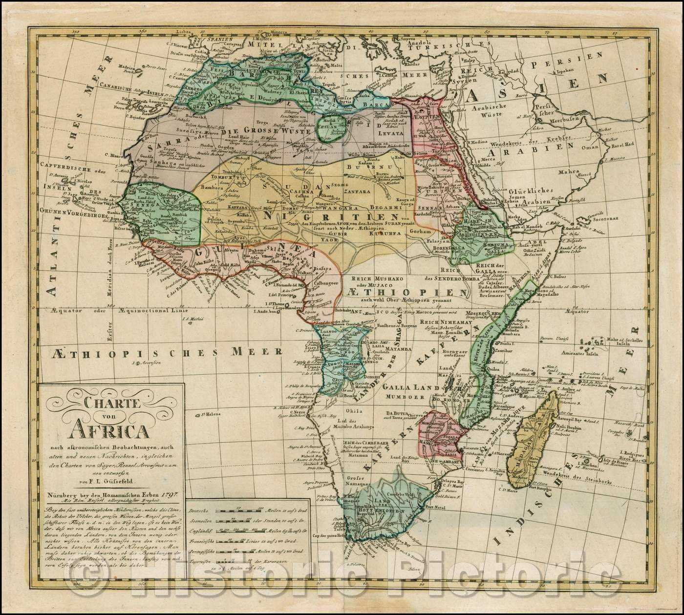 • .Historic Map - Charte von Africa nach astronomischen/Chart of Africa, trade routes are shown in the northern interior, 1797, Franz Ludwig Gussefeld - Vintage Wall Art