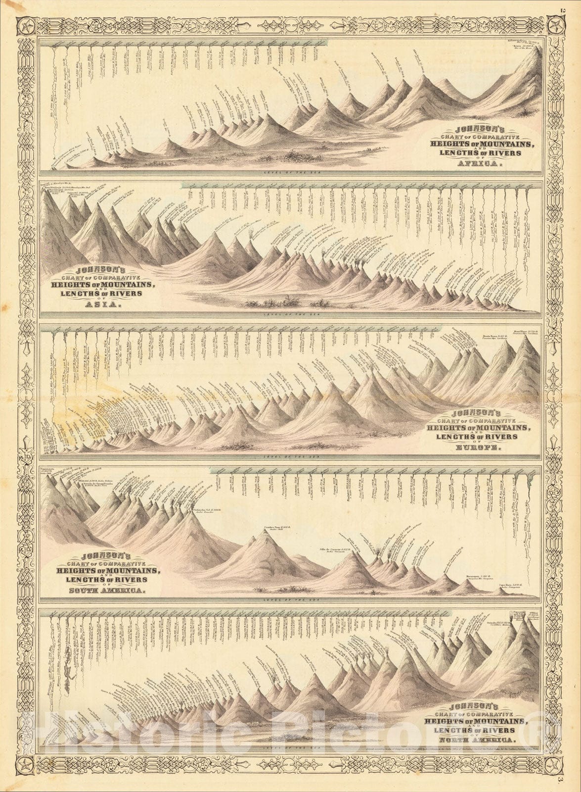 Historic Map : Johnson's Chart of Comparative Heights of Mountains and Lengths of Rivers of Africa and Asia, Europe, South America & North America, 1875, Vintage Wall Art