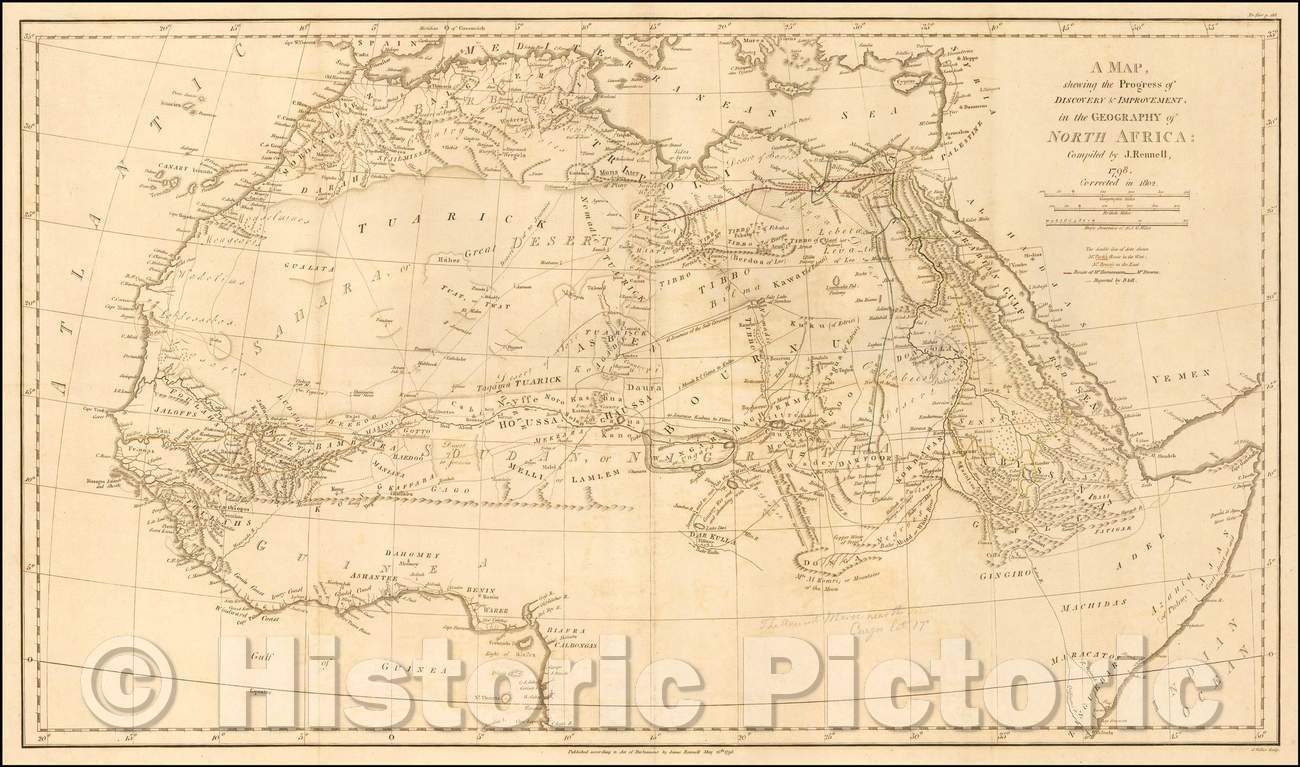 • .Historic Map - A Map, shewing the Progress of Discovery & Improvement, in the Geography of North Africa. 1798, Corrected to 1802, 1802, James Rennell - Vintage Wall Art