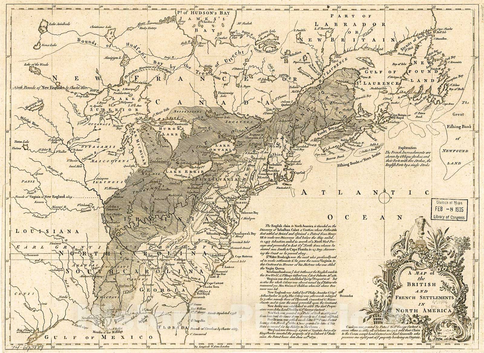 Historic 1750 Map - A map of The British and French settlements in North America.