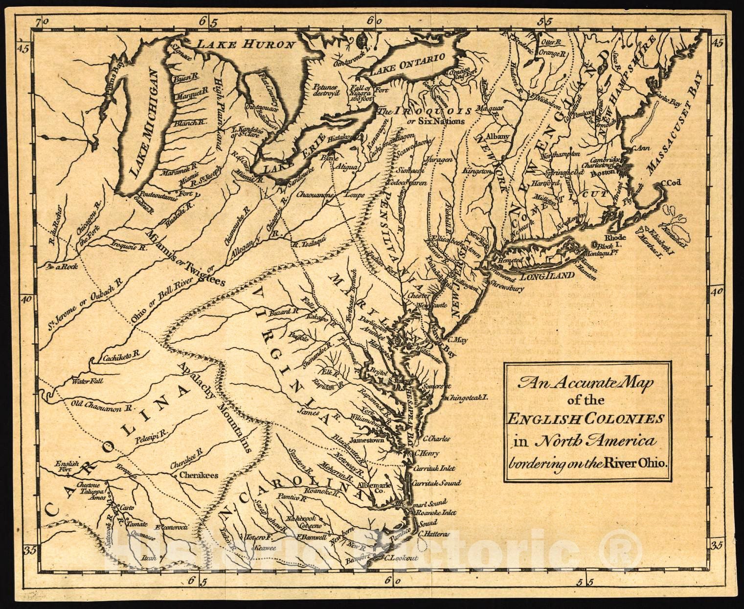 Historic 1754 Map - an Accurate map of The English Colonies in North America, bordering on The River Ohio.