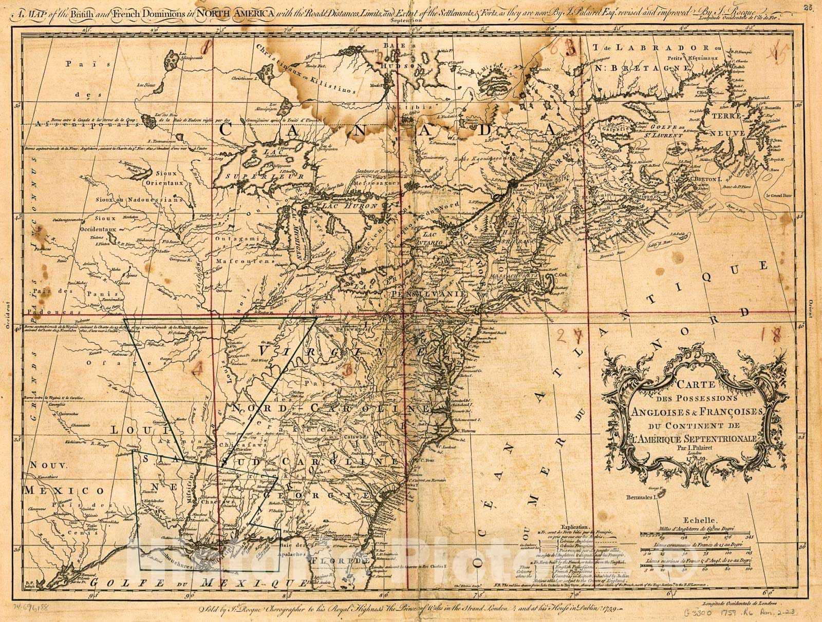 Historic 1759 Map - A map of The British and French dominions in North America with The Roads, Distances, Limits, and Extent of The settlements, forts, as They are Now.