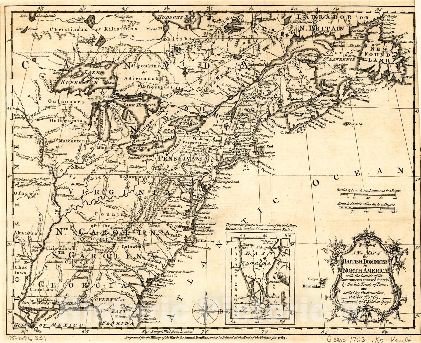• Historic 1763 Map - A New map of The British Dominions in North America; with The Limits of The Governments annexed thereto by The Late Treaty of Peace, and Settled by Proclamation