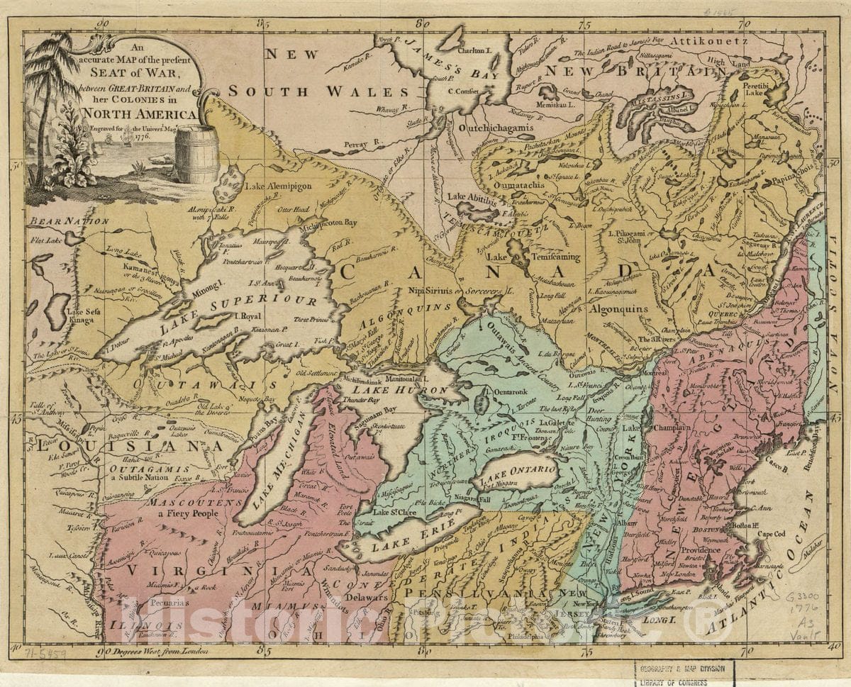 • .Historic 1776 Map - an Accurate map of The Present seat of war Between Great-Britain and her Colonies in North America.