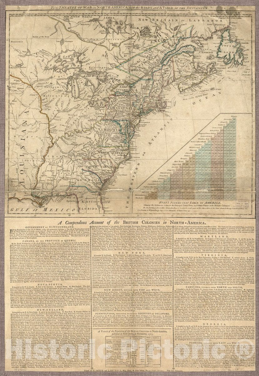 Historic 1776 Map - The Theatre of war in North America, with The Roads and a Table of The Distances.