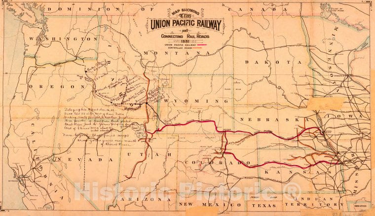 Historic 1881 Map - Map Showing The Union Pacific Railway And Connecting Rail Roads, 1881. - West (U.S.) Maps Of North America. - Vintage Wall Art