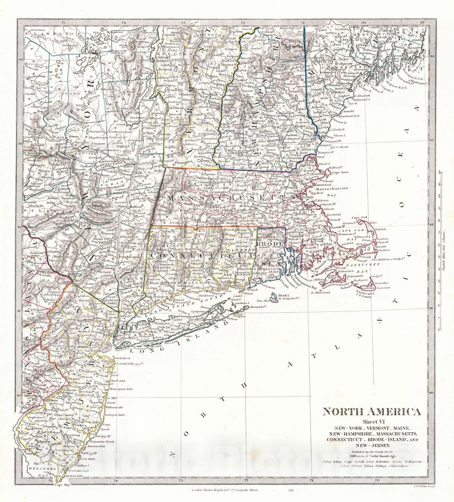 Vintage Map | 1846 North America Sheet VI New-York, Vermont, Maine, New-Hampshire, Massachusetts, Connecticut, Rhode-Island, and New-Jersey | Society for the Diffusion of Useful Knowledge
