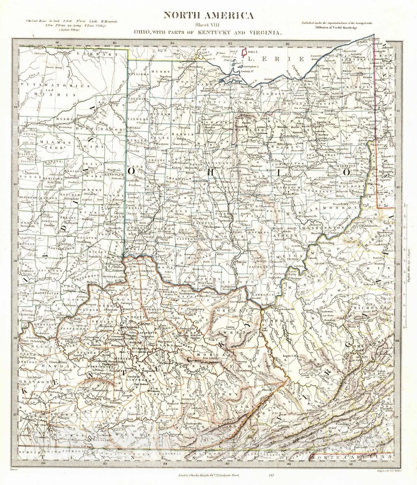 Vintage Map | 1846 North America Sheet VIII Ohio, with Parts of Kentucky and Virginia | Society for the Diffusion of Useful Knowledge