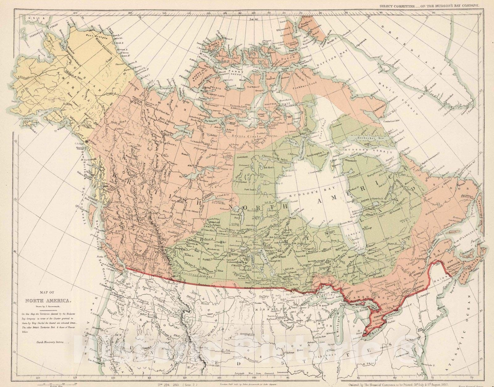Historic Map : 1857 Map of North America. Hudson's Bay Company (Arrowsmith) ordered by House of Commons - Vintage Wall Art