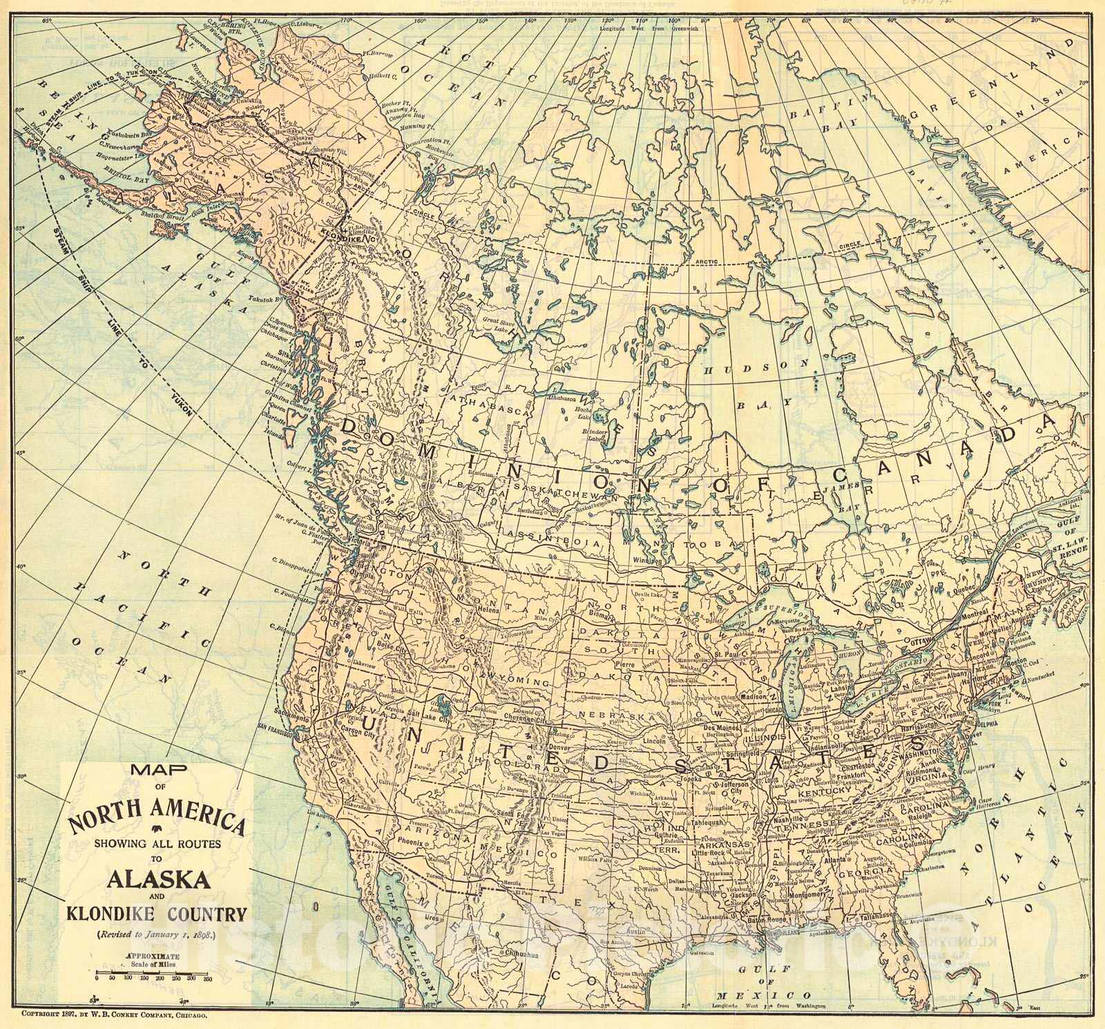 Historic Map : 1898 Map of North America Showing All Routes to Alaska and Klondike County : Vintage Wall Art