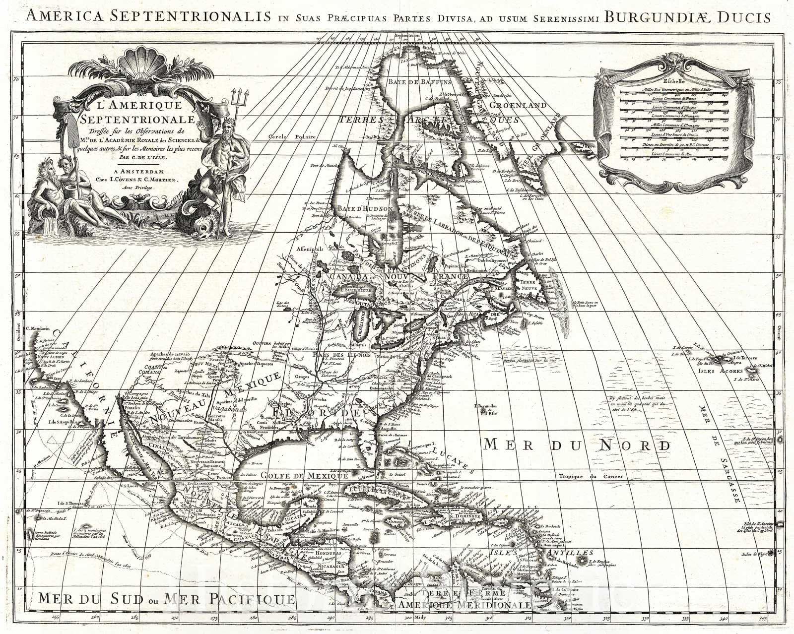 Historic Map : De L'Isle Map of North America (Covens and Mortier ed.), 1708, Vintage Wall Art
