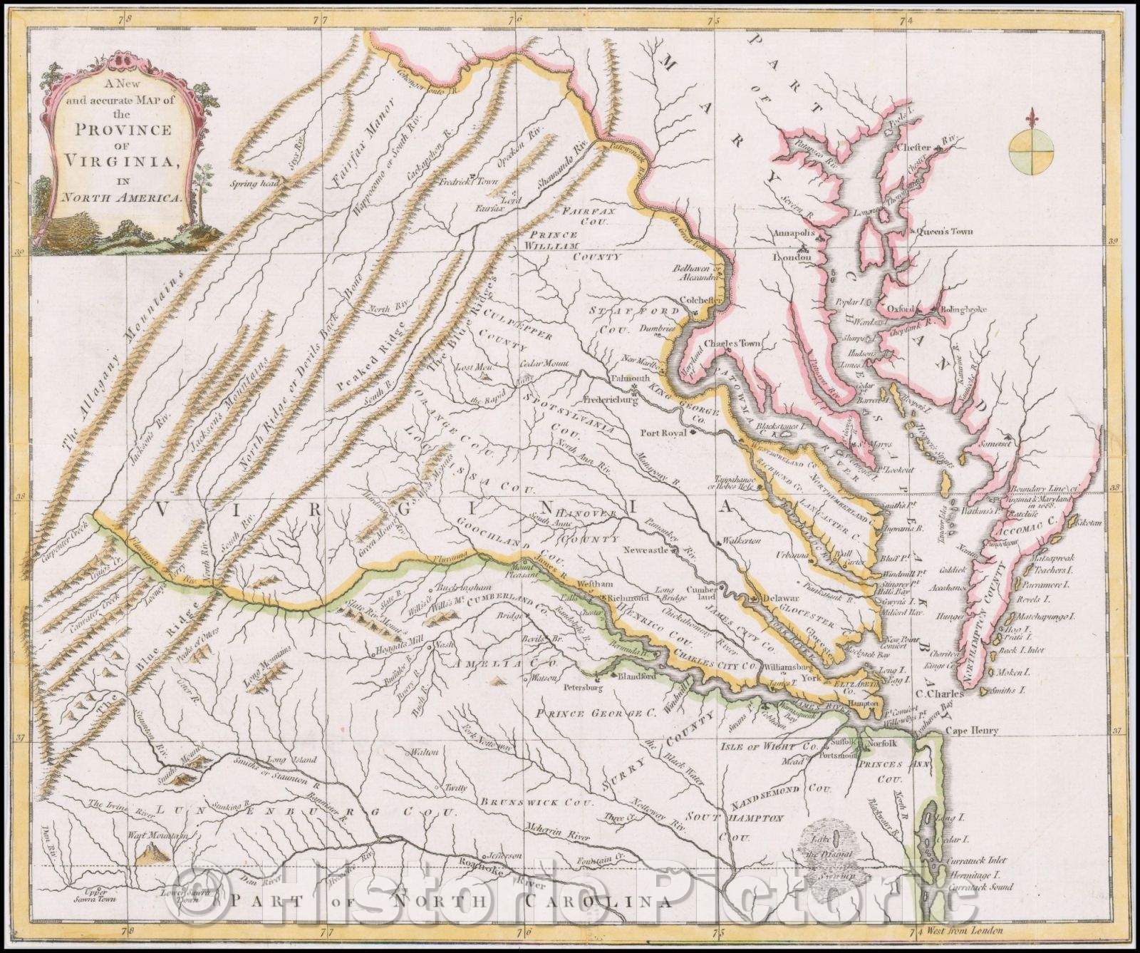 • .Historic Map - A New and Accurate Map of the Province of Virginia in North America, 1779, Universal Magazine - Vintage Wall Art