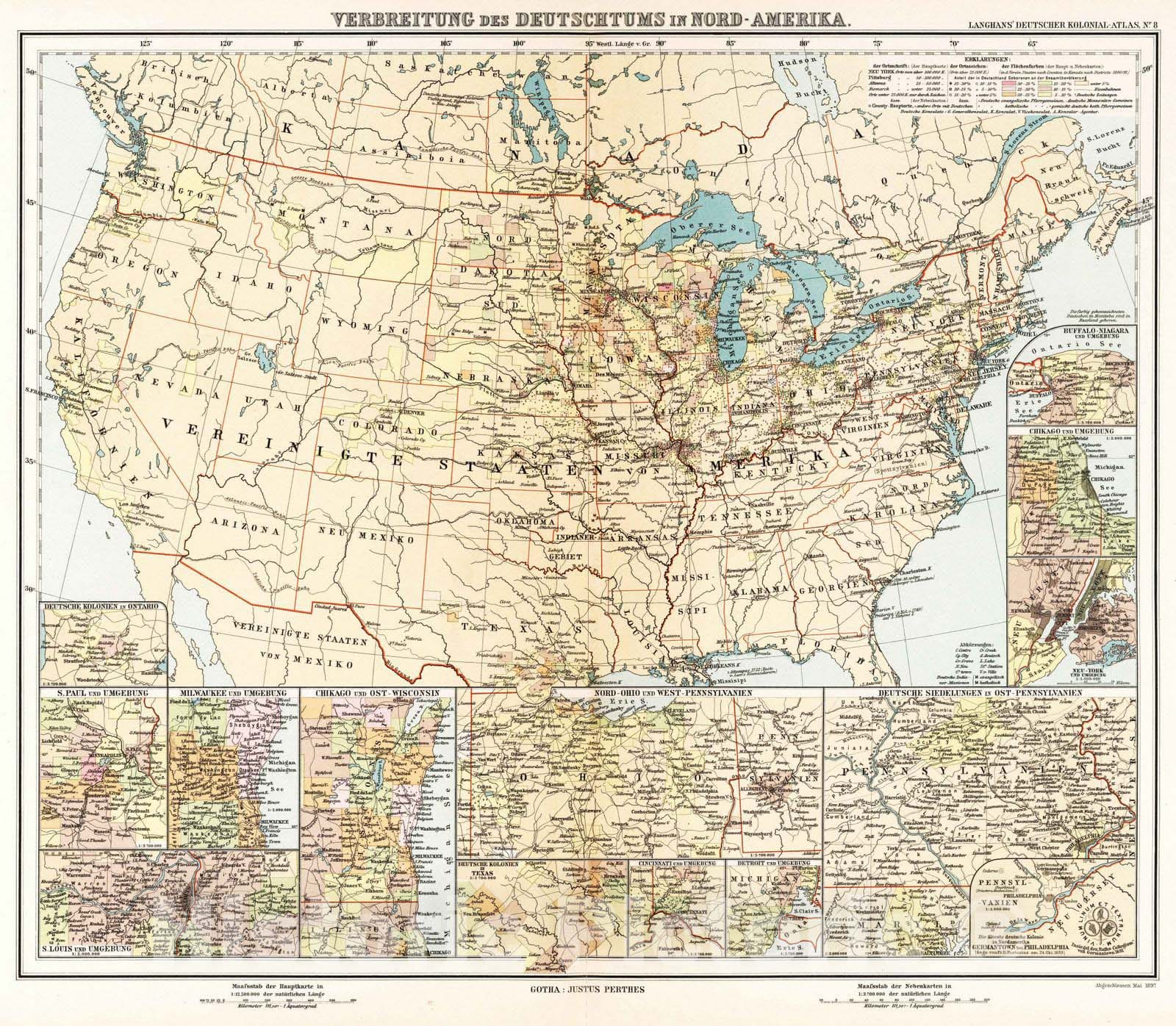Historic Map : United States, 1897 Nr. 8. Verbreitung des Deutschtums in Nord-Amerika. (Dissemination of the Germans in North America.) , Vintage Wall Art