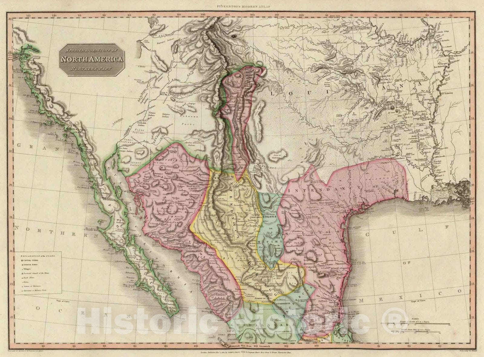 Spanish dominions in North America, northern part. Drawn under the direction of Mr. Pinkerton by L. Hebert. Neele sculpt. 352 Strand. London: published Novr. 1, 1811, by Cadell & Davies, Strand & Longman, Hurst, Rees, Orme, & Brown, Paternoster Row. | A modern atlas, from the latest and best authorities, exhibiting the various divisions of the world, with its chief empires, kingdoms and states, in sixty maps, carefully reduced from the largest and most authentic sources. Directed and superintended by John Pinkerton, author of Modern geography, &c. London: Printed by T. Bensley, Bolt Court, Fleet Street; for T. Cadell and W. Davies, Strand; and Longman, Hurst, Rees, Orme, And Brown, Paternoster Row. 1815. | A superb copy. One of the best English Atlases of the period, similar to Thomson's General Atlas of 1817. See the Philadelphia edition of 1818. Maps are hand painted in full color and bound in new half leather beige cloth covered boards with "Pinkerton Atlas" stamped in gilt on a black spine label.